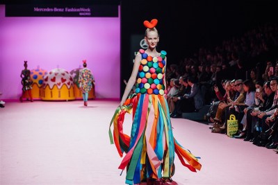 La diseñadora Agatha Ruiz de la Prada ha incorporado al decorado para su desfile en la Mercedes Benz-Fashion Week Madrid varios iglúes de plástico como los que se emplean para reciclar vidrio, con un diseño similar al de los vestidos de la diseñadora madrileña.