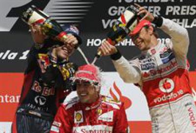 El alemán cogió ritmo y se incorporaba a la lucha por la victoria a sólo seis vueltas del final. La lucha entre el piloto de Red Bull y el de McLaren dio alas a Alonso para firmar su tercera victoria en Hockenheim. En la penúltima vuelta, Vettel llegó a cabo un peligroso adelantamiento sobre Button por el que el germano fue sancionado.