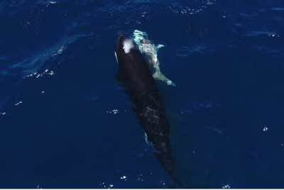 Una orca nadaba con un tiburón blanco juvenil con una herida visible en aguas de Baja California, México.Credit...Marco Villegas