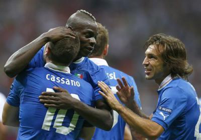Acto seguido, Cassano se revolvió en el área cual rabo de lagartija para zafarse de dos rivales y colgar la pelota al punto de penalti, donde apareció Balotelli para conectar el esférico con la testa y adelantar a su combinado (0-1).