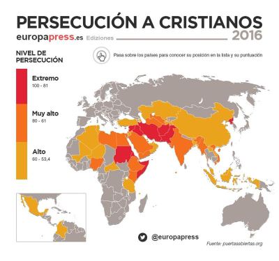 No solo se persigue a los cristianos en el mendo musulman hay otros lugare como la China donde ser cristiano es un grave peligro. Ademas de los asesinatos anteriormente señalados 1062 iglesias han sido atacadas muchas de ellas incendiadas.Pero incluso en los paises occidentales los partidos y movimientos laicistas muestran actitudes agresivas contra el cristianismo. Basta ver en España a Podemos como elemento mas significativo pero no es solo el unico.