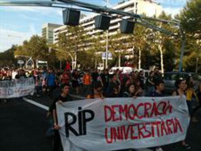 Tras la pancarta RIP Democracia Universitaria, los alumnos avanzan cortando los carriles centrales de la Diagional, así como la circulación del Trambaix y el lateral del lado mar, han informado a Europa Press fuentes de la Guardia Urbana.