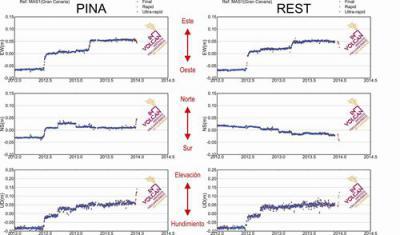Así, desde el 22 al 29 de diciembre se ha registrado un desplazamiento en la vertical de 8,3 centímetros, así como un desplazamiento en la horizontal de 3,6 centímetros hacia el noroeste en la estación gps PINA, que se localiza en el Ayuntamiento de El Pinar. Durante ese mismo periodo, en la estación gps REST, localizada en La Restinga, se ha registrado un desplazamiento en la vertical de 7,9 centímetros, así como un desplazamiento en la horizontal de 3,5 centímetros hacia el suroeste.