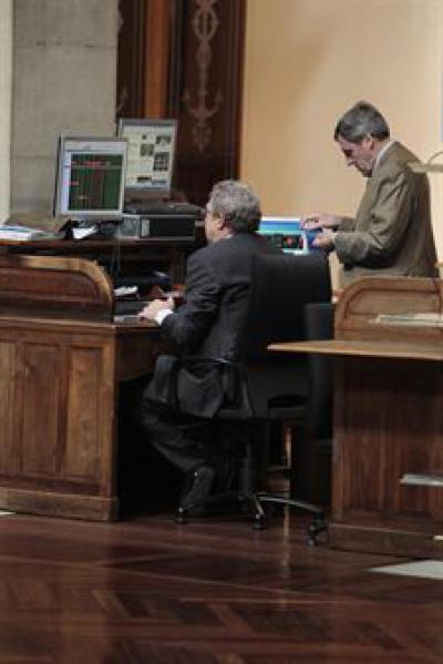 En el mercado de deuda la prima de riesgo ofrecida a los inversores por los bonos españoles a diez años respecto a sus homólogos alemanes se situaba en los 382,10 puntos básicos, con un rendimiento del 5,235%, frente a los 400 puntos básicos de la apertura.