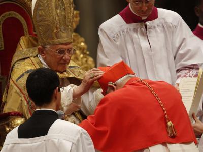 En la fotografía (de Reuters Pictures, tomada de www.daylife.com) el Papa entrega el birrete al único cardenal español del Consistorio, monseñor Estepa Llaurens