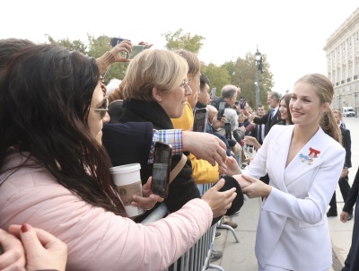 La Princesa de Asturias, acompañada por los Reyes y la Infanta Sofía, han salido a primera hora de esta tarde a la Plaza de Oriente, frente al Palacio Real, para saludar a los cientos de ciudadanos que aún seguían allí congregados para agradecerles el cariño que han mostrado durante toda la jornada a la heredera al trono.