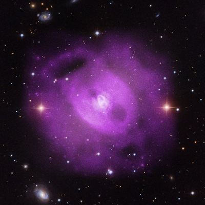 Cada uno de los tres pares de cavidades está asociado con un frente de choque, visible como bordes afilados en la imagen de rayos X. Estos frentes de choque, similares a los estampidos sónicos de un avión supersónico, calientan el gas, evitando la refrigeración y la formación de un gran número de nuevas estrellas.