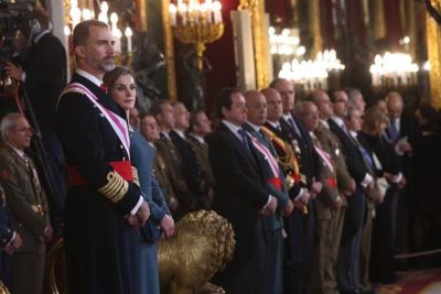 Tras la interpretación del Himno Nacional, el monarca ha pasado revista a una formación de la Guardia Real y después Don Felipe y Doña Letizia han accedido al Palacio para saludar a las autoridades en la saleta Gasparini.