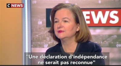 "Si hubiera una declaración de independencia sería unilateral y no sería reconocida", ha asegurado la secretaria de Estado gala, en una entrevista concedida a la cadena de televisión francesa CNews. "La primera consecuencia sería automáticamente la salida de la Unión Europea", ha añadido.