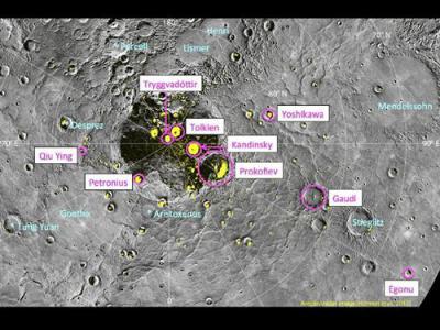 Así, además de Gaudí, Kandinsky y Tolkien, también tienen su propio cráter el pintor nigeriano Uzo Egonu; el cortesano romano de Nerón, Tito Petronio, que se cree que es el autor del Satiricón; el pianista ruso Sergei Prokofiev; la artista islandesa Nina Tryggvadóttir; el pintor chino Qiu Ying; y el novelista japonés Eiji Yoshikawa.