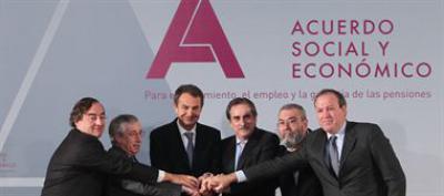 El pacto ha sido firmado por el propio Zapatero, el ministro de Trabajo e Inmigración, Valeriano Gómez, el presidente de CEOE, Juan Rosell, el presidente de Cepyme, Jesús Terciado, y los secretarios generales de CC.OO. y UGT, Ignacio Fernández Toxo y Cándido Méndez, respectivamente.