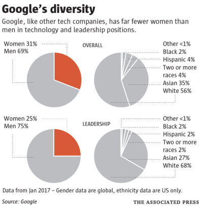 Por otra parte, Damore afirma en su "memo" que "Google ha creado varias prácticas discriminatorias: programas, "mentoring" y clases sólo para gente de ciertas razas o sexo; prácticas de contratación que bajan de hecho el listón de exigencia para los candidatos "de la diversidad" [mujeres o personas de raza no blanca]". Pero esto significa que la compañía antepone su obsesión por el género y la raza a la búsqueda del talento individual: prefieren la diversidad a la calidad.