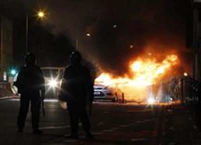 "Varias botellas fueron lanzadas contra dos coches de Policía, provocando que uno de ellos ardiera. El segundo coche fue empujado hasta la mitad de High Road y fue incendiado también", ha agregado el portavoz. "Los agentes no estaban dentro de los vehículos y por tanto no hay heridos", ha apostillado.
