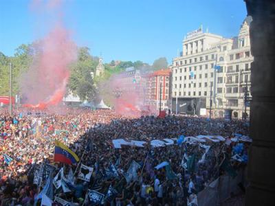 Miles de personas se han concentrado desde minutos antes de las 19.00 horas en la Plaza del Arriaga, donde se ha desplegado un mural gigante en el que se podía leer "amnistía" así como numerosos carteles con fotos de presos de ETA y pancartas que reclamaban su regreso a Euskadi. También la plataforma Herrira ha desplegado una pancarta gigante con globos azules para exigir la vuelta de los reclusos.
