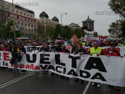 La manifestación 'Revuelta de la España Vaciada' ha comenzado en la Plaza de Colón, desde donde los manifestantes se dirigen por el Paseo de Recoletos hasta Cibeles para finalizar en la Plaza Cánovas del Castillo, frente a la fuente de Neptuno.