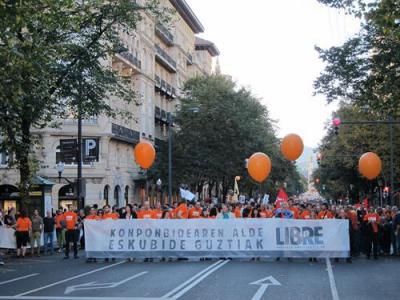 La marcha ha comenzado a las cinco y media de la tarde desde la plaza del Sagrado Corazón tras una pancarta con el texto "En favor de la solución. Todos los derechos. Tras ella, marchaban cerca de 40 jóvenes imputados por pertenencia a Segi, que portaban camisetas con el texto "Desde la solidaridad hasta el compromiso", y otros tantos imputados por el caso de las Herriko Tabernas.