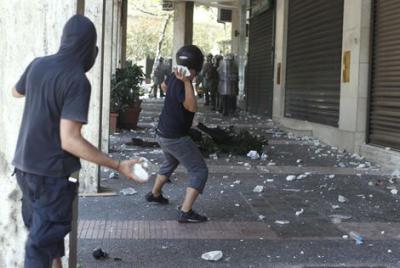 Miles de personas --unas 20.000-- se han concentrado en la céntrica plaza Syntagma cerca del Parlamento, donde cientos de jóvenes encapuchados comenzaron a lanzar piedras y botellas a los policías, que respondieron con gases lacrimógenos.