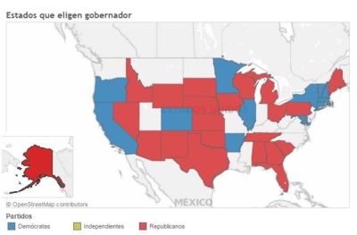 En la actualidad, hay 29 gobernadores republicanos y 21 demócratas, pero el martes solo están en liza 36 estados, 22 en manos de republicanos y catorce de demócratas. En el caso de los republicanos, el 95 por ciento optan a su reelección, mientras que el 80,1 por ciento de los demócratas buscarán un nuevo mandato, según el 'think-tank' Hispanic Council.