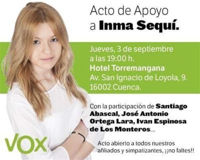Los líderes nacionales de Vox arroparán este jueves en Cuenca a Inma Sequí
