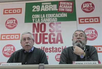 Los secretarios generales del CC.OO. y UGT, Ignacio Fernández Toxo y Cándido Méndez, han explicado que las manifestaciones convocadas en toda España para el 29 de abril quieren ser "un mensaje nítido y potente" al Gobierno para que rectifique su política, y, aunque por el momento no han hablado de una nueva huelga general, han avanzado que podría haber más movilizaciones si el Ejecutivo sigue sin reaccionar.