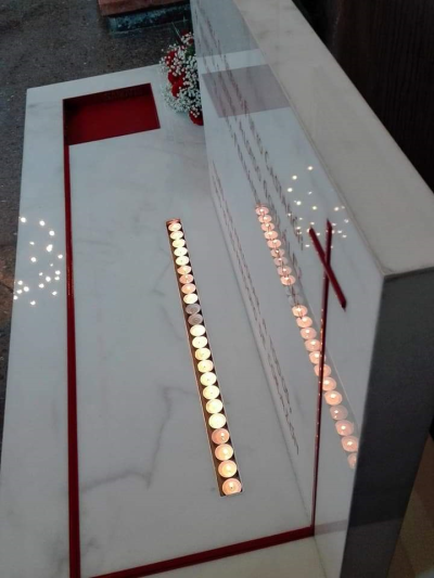 La tumba lleva, en color rojo, una Cruz y la sangre de los Beatos. Junto al nombre de los
