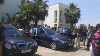 Un importante cordón de la Guardia Civil custodiaba las entradas y salidas al polideportivo municipal, al que han dejado entrar vecinos hasta que se ha llenado el pabellón y han cerrado el paso, por lo que cientos de vecinos se han quedado a las puertas de este recinto deportivo esperando la salida de los féretros. Tampoco se ha permitido el acceso a los medios de comunicación.