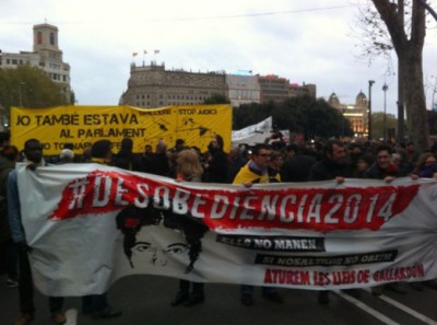 La manifestación, no notificada y que no ha comunicado su recorrido, ha arrancado en plaza Catalunya, ha subido por paseo de Gràcia y ha girado en Gran Via de les Corts Catalanes, encabezada por dos grandes pancartas en las que se puede leer 'Desobediencia 2014' y 'Jo també estava al parlamenta i ho tornaria a fer'.