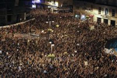 Miles de personas permanecen pasadas las 3.30 horas de la madrugada en la Puerta del Sol, en la que ya se registra un descenso considerable en el número de manifestantes respecto a la gran concentración de esta noche.