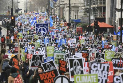 Manifestantes de todo el mundo se han reunido en Londres para protestar pidiendo más "libros, no bombas" o "recortes en la guerra, y no en el bienestar", críticas a las que se le suma el coste que tendrá la renovación de este programa en medio de un momento de austeridad.