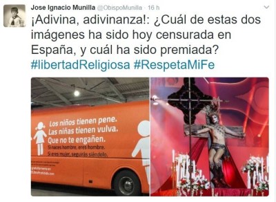 Asimismo, ha colgado una imagen del citado autobús, junto a otra del ganador de la gala Drag del Carnaval de las Palmas de Gran Canaria, simulando la crucifixión de Jesucristo, con la frase "¡Adivina, adivinanza!: ¿Cuál de estas dos imágenes ha sido hoy censurada en España, y cuál ha sido premiada?" y las etiquetas