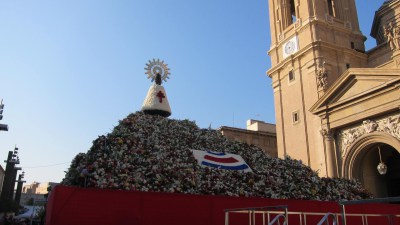 En la plaza del Pilar, hay una estructura de más de 15 metros de alto y 16 de ancho, que ya está completamente cubierta y que en estos momentos sostiene más de seis toneladas de flores, si bien la previsión es que se alcancen las ocho toneladas. Está coronada por una imagen de la Virgen del Pilar, bajo la que se extiende este gran manto floral.