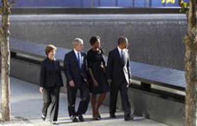 Acompañados de sus respectivas esposas, Michelle Obama y Laura Bush, han rendido unos minutos de silencio ante el monumento de agua en torno al cual están grabados los nombres de las casi 3.000 víctimas mortales del ataque contra las torres gemelas del World Trade Center.