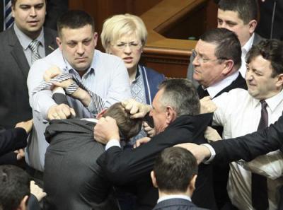 Los ultranacionalistas intentaron callar a Yefremov al grito de Habla ucraniano y Vergüenza antes de que se desatara un enfrentamiento a puñetazos. Tras el mismo, el presidente del parlamento, Volodimir Ribak, anunció un receso y llamó a consultas a los líderes de ambos partidos.