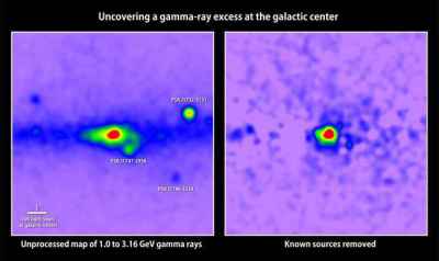 Usando datos del Telescopio Espacial Fermi de Rayos Gamma de la NASA, científicos del Laboratorio Acelerador Nacional Fermi (Fermilab), el Centro Harvard-Smithsoniano para Astrofísica (CfA), el Instituto Tecnológico de Massachusetts (MIT) y la Universidad de Chicago, han elaborado nuevos mapas que muestran que el centro galáctico produce más rayos gamma de alta energía de los que pueden ser explicados por fuentes conocidas, y que este exceso de emisión es consistente con algunas formas de la materia oscura "Los nuevos mapas nos permiten analizar el exceso y probar si las explicaciones más convencionales, tales como la presencia de los púlsares no descubiertos o colisiones de rayos cósmicos en las nubes de gas, pueden dar cuenta de ello", dijo Dan Hooper, un astrofísico en el Fermilab en Batavia, Illinois, y autor principal del estudio . "La señal que nos encontramos no puede ser explicada por las alternativas propuestas actualmente y está en estrecho acuerdo con las predicciones de modelos muy simples de materia oscura".