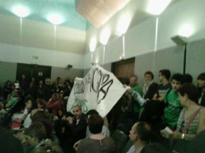 Alrededor de las 9.50 horas, algunos de los estudiantes que permanecían en el exterior han entrado en el salón de actos con una pancarta en la que se podía leer "Políticos a la hoguera. Nuestros recortes serán con guillotina. Espe, muérete", y con estas palabras hacia la dirigente autonómica han permanecido gritando durante minutos.