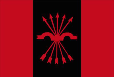 Tiene mucho parecido esta bandera de los falangistas con otra de la CNT, Rojo y negro, la capa del conocido conde Dracula ( el del cine) era negra por fuera y rojo su forro. Nada tiene que ver con el verdadero Príncipe Vlad Draculea 1431-1476 conocido por Vald Empalador, con poca gente como el los islamistas serian historia al menos dentro de las Fronteras de Europa, en fin es algo que ahora no viene al caso.