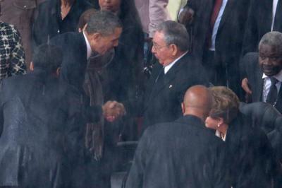 Saludo histórico entre Obama y Castro durante el funeral de Mandela