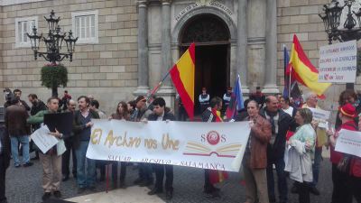 Unas 30 personas, convocadas por esta asociación, se han concentrado ante la Generalitat en la plaza Sant Jaume de la capital catalana, y han gritado consignas como 'Por un archivo unido, por una España unida', tras una pancarta con el lema 'El archivo nos une'. También han entregado al presidente de la Generalitat, Carles Puigdemont, una carta en la que le reclaman "la devolución al Archivo General de la Guerra Civil Española, con sede en Salamanca, de la documentación que mantiene indebidamente en su poder