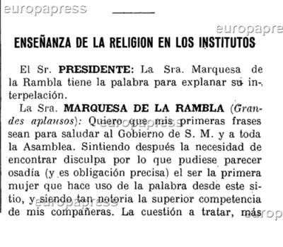 Pero antes de entrar en materia, tras un saludo protocolario y sabedora del hecho histórico que iba a protagonizar arrancó casi pidiendo perdón. "Sintiendo pues la necesidad de encontrar disculpa por lo que pudiese parecer osadía (y es obligación precisa) el ser la primera mujer que hace uso de la palabra desde este sitio y siendo tan notoria la superior competencia de mis compañeras..." empezó la parlamentaria.
