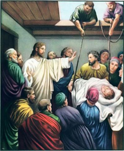 Así estaba de quieta la escena cuando es interrumpida por cuatro que llegan con un paralítico en la camilla. Tanta gente había que es imposible llegar hasta el Maestro y no se les ocurre otra cosa más práctica y audaz que la de levantar algunas tejas y descolgar al enfermo desde el techo. Nos podemos imaginar cómo seguirían todos la audacia tan llena de fe de estos hombres. Hasta el mismo Jesús quedó impresionado y le curará en el acto: tus pecados son perdonados.