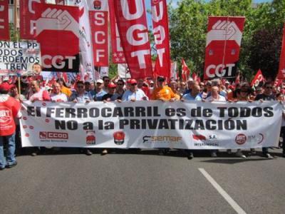 Los sindicatos con representación en Renfe, Adif y Feve (CC.OO., UGT, CGT, SF, Semaf y Sindicato de Circulación) han protestado este sábado en una manifestación en Madrid contra la privatización del ferrocarril, al tiempo que han pedido el mantenimiento del empleo en el sector.