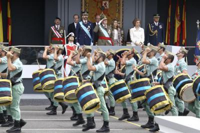 Inmediatamente después ha comenzado la parada, que este año no ha contado con carros de combate ni aviones. Los 2.600 militares que participan en la parada lo han hecho a pie, a excepción de la unidad motorizada de la Guardia Real y los reservistas y veteranos, que lo han hecho en vehículos ligeros "Aníbal". Entre ellos había antiguos miembros del regimiento Alcántara 10, recientemente condecorado con la Laureada colectiva de San Fernando, la máxima condecoración militar.