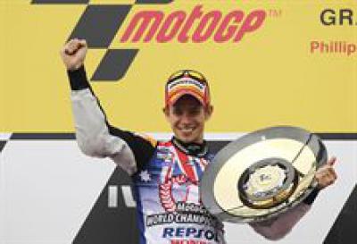 El piloto australiano Casey Stoner (Honda) ha confirmado a lo grande su segundo título mundial en MotoGP, logrando la victoria ante su público en el día de su 26º cumpleaños, mientras que Marc Márquez (Suter) ha perdido el liderato en Moto2, pero ha salvado la papeleta gracias a una gran remontada de 35 puestos hasta acabar tercero en el Gran Premio de Australia.