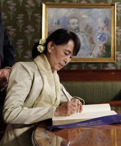 "La paz absoluta en nuestro mundo es un objetivo inalcanzable", declaró Aung San Suu Kyi durante la ceremonia. "Hay hostilidades en el norte y en el oeste", declaró sobre la situación actual en su país, dominado por brotes de violencia local que desembocan en incendios intencionados y asesinatos que tienen lugar desde hace varios días".