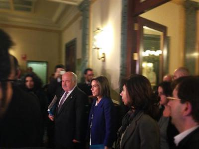 En el trayecto desde el pasillo del Senado al coche oficial de la ministra surgieron las primeras quejas de algunos miembros de la prensa debido a que entendían que los ujieres y agentes de la policía no les estaban dejando grabar y fotografiar a la ministra.