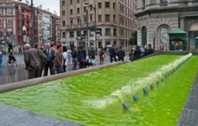 En Bilbao, también han aparecido con el agua verde fuentes céntricas como la de la plaza Moyúa, la fuente de Jado o la de la plaza Circular. Al mediodía los operarios de limpieza vaciaban y limpiaban la fuente de Moyúa.