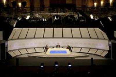 En el plató, creado para la ocasión y ocupado tan sólo con una gran mesa blanca, tres sillas negras y un letrero luminoso con fondo azul en el que lucen en blanco los números que conforman 2011, operarios técnicos y de limpieza realizan los últimos retoques para que todo esté listo para el arranque de la cita, previsto para las 21.46 horas.