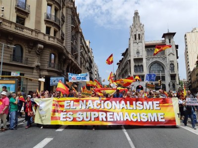 Los manifestantes, precedidos por una pancarta con el lema 'El nacionalismo es supremacismo', han portado banderas españolas, catalanas y de Tabarnia y gritado consignas como: "Torra racista, el primero de la lista", "Puigdemont a prisión", "En pie si eres español", "Viva España" y "Catalanidad es hispanidad".