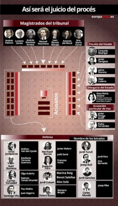 El tribunal que juzgará a partir del próximo martes 12 de febrero el 'procés' independentista en Cataluña, integrado por siete magistrados de reconocida trayectoria, es calificado en ámbitos jurídicos de 'equilibrado" por representar en un mismo órgano práctica totalidad de sensibilidades en la carrera judicial.