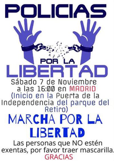"Con esta marcha queremos unir a policías y ciudadanos y queremos mostrarle al Gobierno nuestro total desacuerdo con todas las medidas restrictivas de derechos que está imponiendo a todos los españoles y pedirle que deje de utilizar a los policías y guardias civiles para meterle miedo a los ciudadanos y para sus fines políticos", ha dicho la portavoz de la asociación en un vídeo, que tiene casi 30.000 visualizaciones en YouTube.